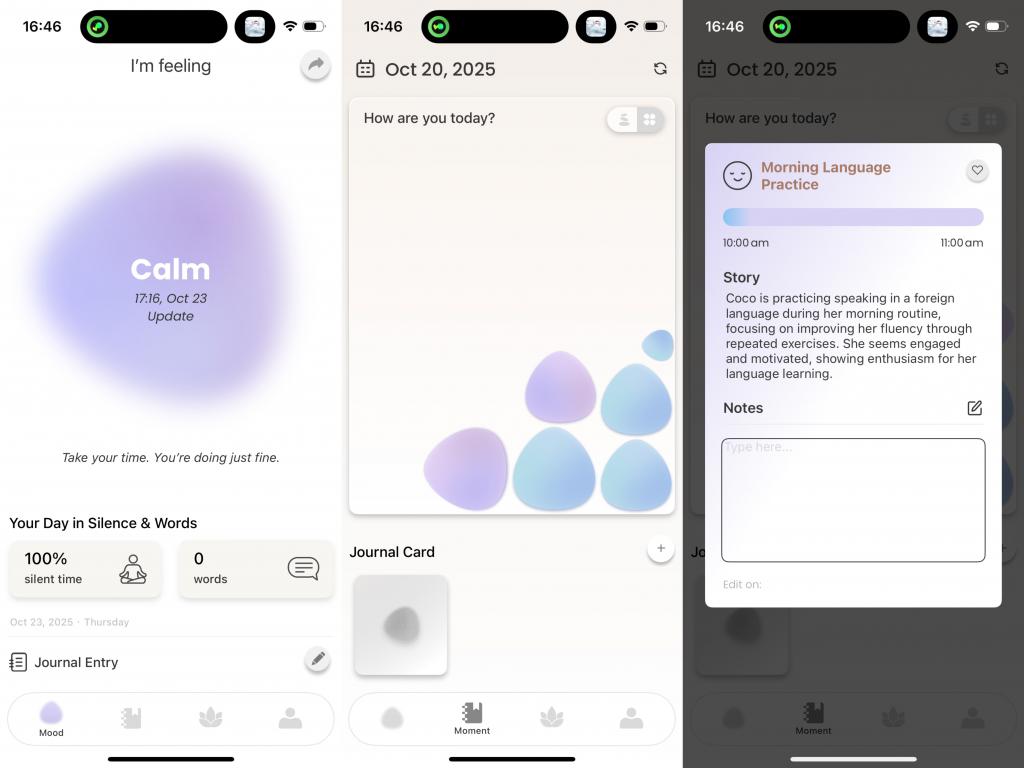 它有一个类似「自动日记」(Auto-Journal)的功能,能自动标记一天中情绪波动最显著的时刻,用户无需手动记录,只需在一天结束后打开 App 回顾这些被高亮标记的「情绪节点」,并通过反思(例如「下午 2:15 情绪下降,原来是在处理一点棘手的工作」)来发现自己独特的情绪模式和压力触发点。