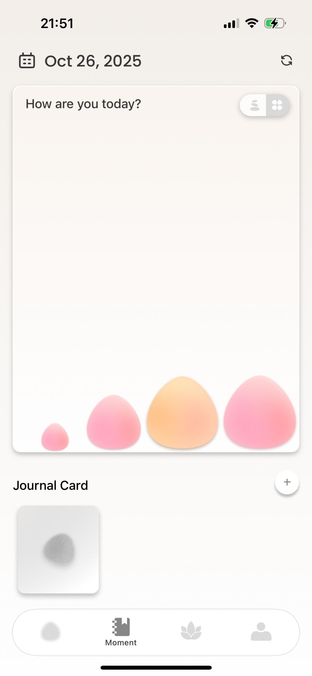 在 App 中,一个名为「Moment」的页面扮演了核心角色。它像一个「小罐罐」,每小时会自动掉落一个鹅卵石形状的「小球」。小球的颜色代表了你这一个小时的总体情绪状态。点开这个小球,用户不仅能看到情绪的变化曲线,还能看到「这一个小时里面发生的一些重要事件」。